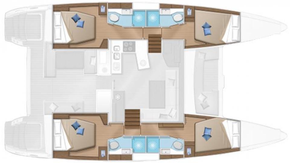 Deze 4-cabinelay-out biedt veel ruimte en privacy benedendeks. De moderne styling en comfortabele leefruimte maken je verblijf aan boord tot een ware luxe vakantie. De salon en kombuis hebben grote ramen waardoor de boot licht en luchtig aanvoelt. Bovendien geniet je daardoor optimaal van je omgeving, waar aan boord je je ook bevindt.